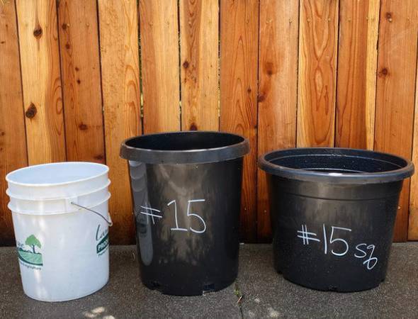 15 gallon squat (new injection molded pots) for $8.75 each (25+ pieces for $7.95 each), pallet price please call, a pallet holds 420 pieces