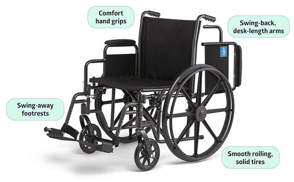Brand New Medline Comfortable Folding Wheelchair with Swing-Back Desk-Length Arms and Swing-Away Footrests, Amazon's sale price $149
