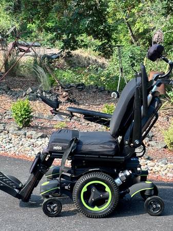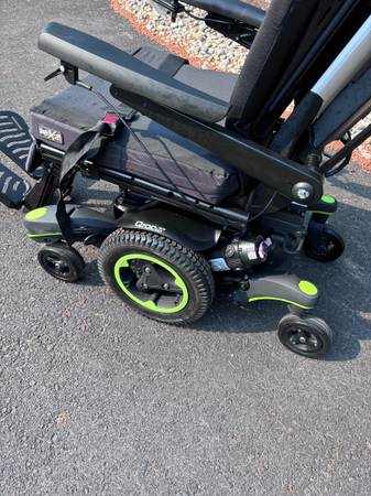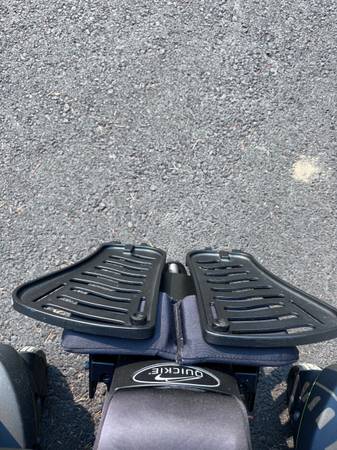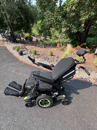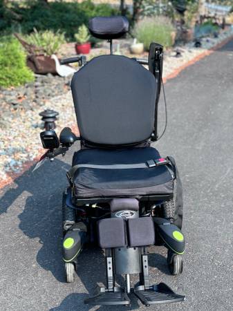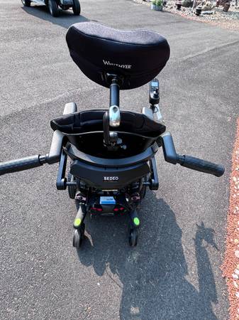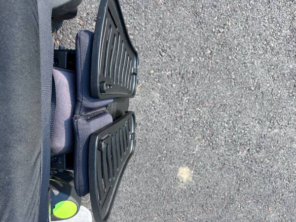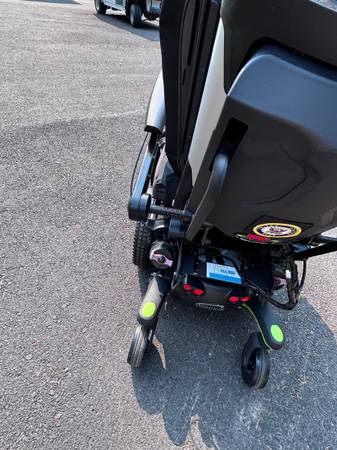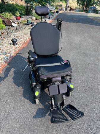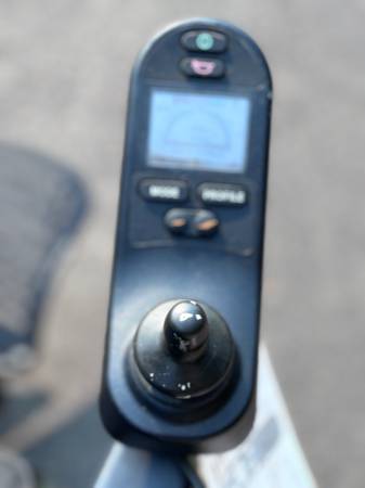 Like new. Batteries are in great condition. Horn, lights, controls all work. Hydraulic tilt and adjustable hydraulic feet rest. Digital display on controller. Weighs a little over 300 pounds. Has a seat belt. It's adjustable in many ways. The seat is about 20" wide and 18" deep. The backrest is about 20" wide and 32" tall to the top of the headrest. Adjustable. The front wheelbase is about 25" wide.