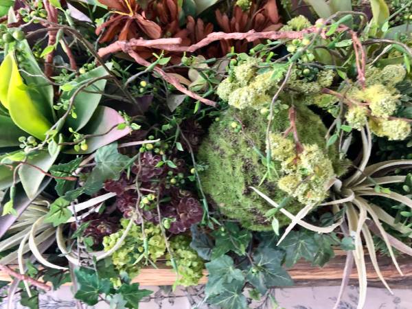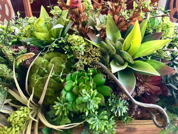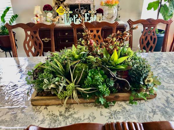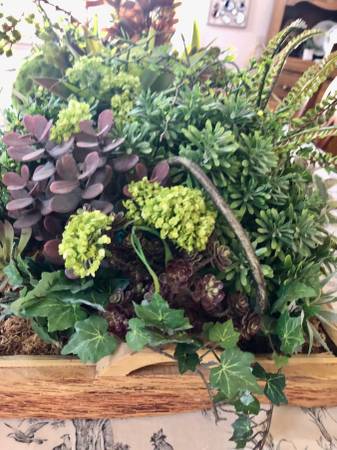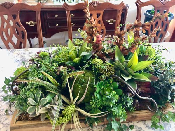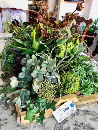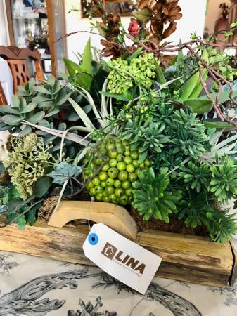 A tray of Beautiful Silk floral/ cactuses arrangement; design by Rosie of LINA Home furnishings for home decor or for office decor. It’s like new and ready to find a good home or office space. Must see!