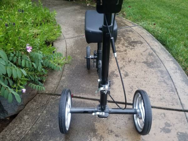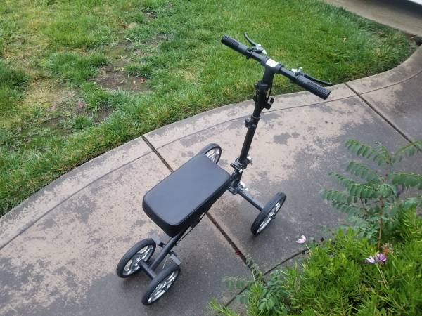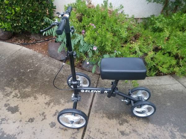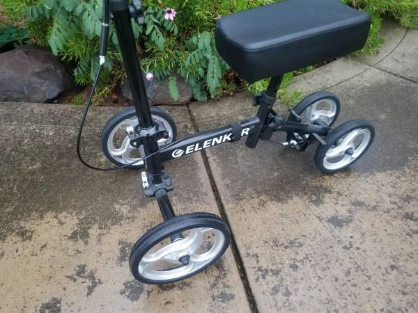 Barely used Steerable Elenker Knee Scooter / Walker - near new. Bought for injury and future surgery and recovery, and then not needed. Works perfectly. No damage. Alternative to crutches. Black in color. Dual adjustable brakes. Serious inquiries only please. Responses without a phone number won't be answered. Thank you for looking.