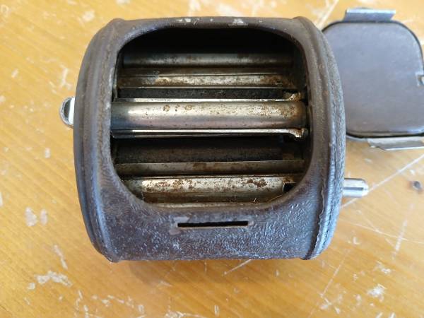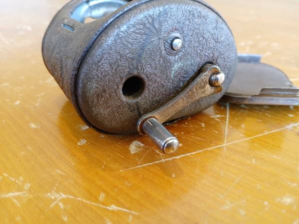 The sharpener is in good working order—the crank turns smoothly and the internal rollers move as they should. There are no dents or chips on the body, just the normal wear and patina you'd expect from a piece this old. The inside has some rust, which is a great opportunity for a light cleaning and restoration.