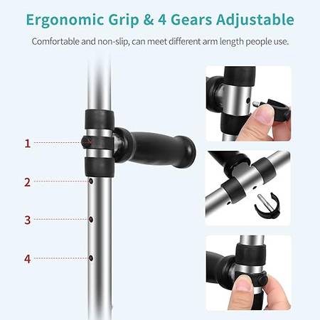 【ADJUSTABLE CRUTCHES】:Ergonomic design of the grip with 4 adjustable positions, comfortable and non-slip handle can meet the use of different arm length. And 9 adjustable points suitable for any height between 63"-73",making it suitable for men, women, and youth, tall or short.
