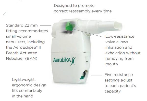 The Aerobika Oscillating Positive Expiratory Pressure Therapy System is a Mucus Clearance Device. This PEP Therapy System is a Respiratory Therapy device that creates pressure in the lungs to keep the airway from closing and help move mucus into the larger airway passages where it may be coughed out. This therapy system can be life-changing for people with breathing-related disorders, such as chronic obstructive pulmonary disease (COPD) pneumonia, emphysema, chronic bronchitis, bronchiectasis, and cystic fibrosis. The Aerobika device naturally opens weak or collapsed airways to allow more oxygen intake without the need of medication. Movement of mucus has been clinically proven to decrease cough frequency and breathlessness. Individuals with COPD who use this device have found an increased exercise tolerance for a more active lifestyle and a better quality of life.