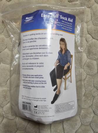 The flexible plastic core of the Norco® Easy-Pull™ Sock Aid allows people to use just one hand to shape the trough easily to slide it into a sock. Foot slides easily on the polyester lining while the sock remains secure.