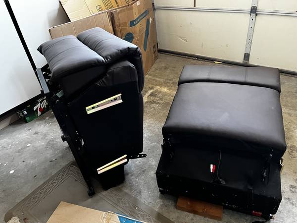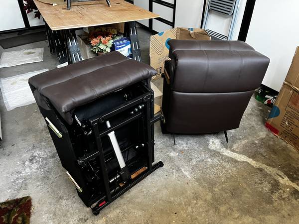 Two brand new Flamaker brand Power Lift Recliner Chair bases only. Accidental shipments, not returnable. Unpacked, never assembled or used. Includes power and controls. Brown, smooth leather-like material.