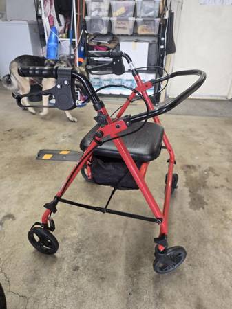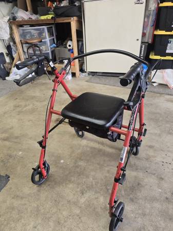 4 wheel red walker with seat and brakes, Works great Pouch under seat and folds up to easily put in trunk or backseat