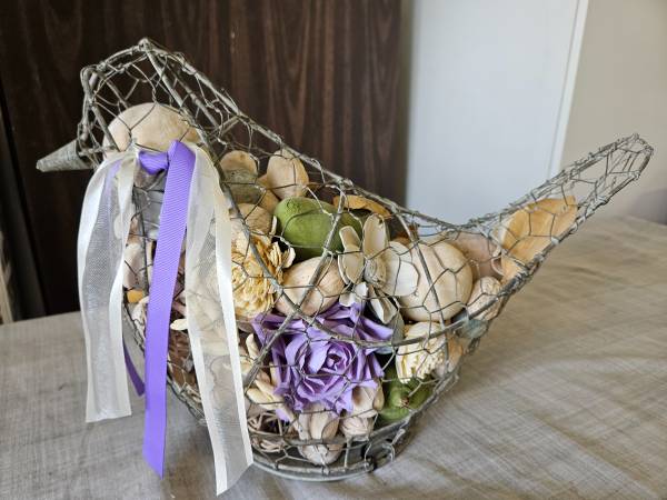 Chicken wire, bird that holds potpourri. You can either replace potpourri with new, or you could add essential oils to what's in there now. About 15" in length, 10" tall, 6" depth.