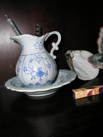 pic #16. vintage looking white and blue trim pitcher &wash basin in good condition $10