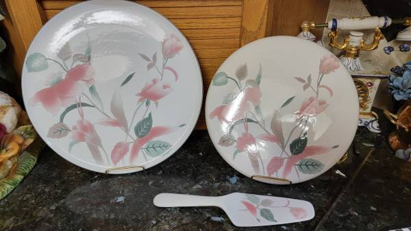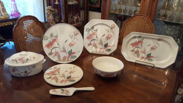 Great condition with no cracks, chips or even scratches and do not appear to ever have been used at all. Not even shelf marks! It is a BEAUTIFUL set! GREAT addition to your dining and kitchen! CASH only. NO SCAMMERS bk shd