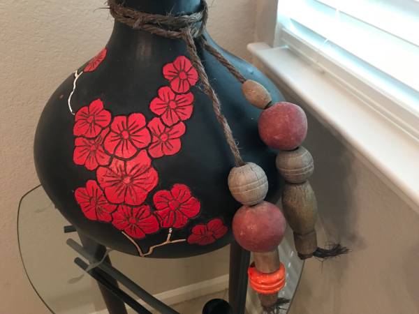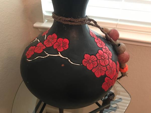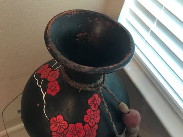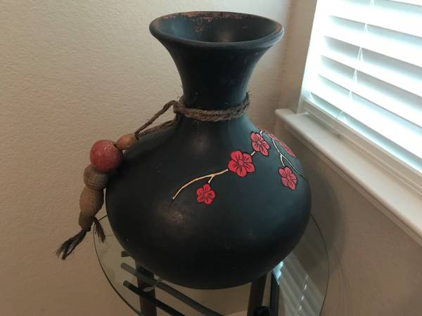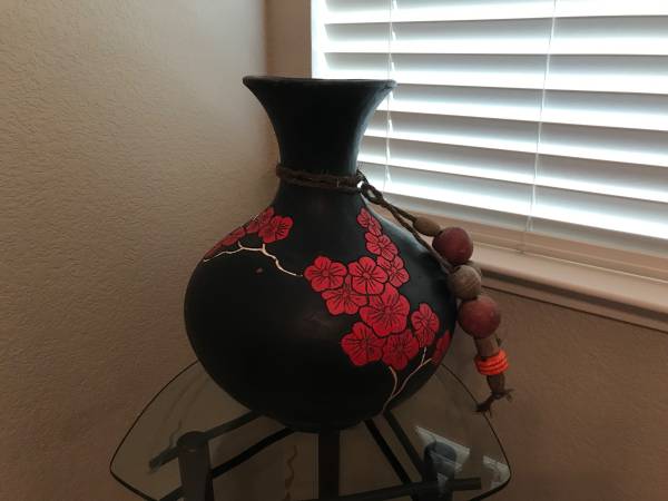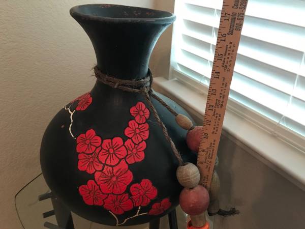 It’s an old pottery that has lots of charm. It has beautiful had painted red cherry blossoms around it. It’s a great display on its own or put a couple cherry blossom branches in it.