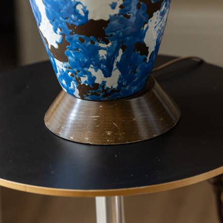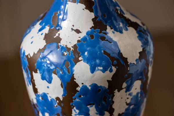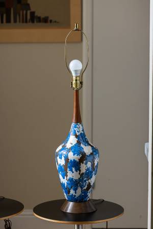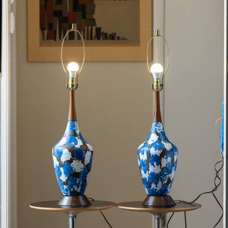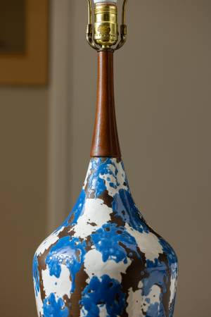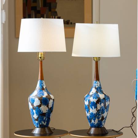 Bold mid-century ceramic lamps by Honi Chilo with sculptural forms and a striking high-gloss drip glaze in cobalt blue, ivory, and chocolate brown. Each piece features a unique glaze pattern, walnut neck, and matching walnut base.
