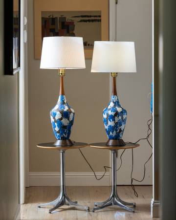 Ceramic portions are in excellent condition with no chips. The bases show light wear. Includes two newer linen drum shades (not original) that pair well with the form.