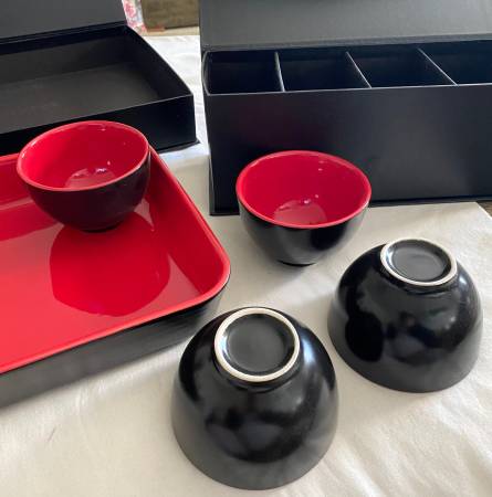 HERE IS A REALLY PRETTY BRAND NEW RED & BLACK CERAMIC SERVING / BAKING DISH WITH FOUR MATCHING BOWLS ... BOTH COME IN THEIR VERY HEAVY STORAGE CASES .... CHECK OUT ALL MY OTHER ITEMS FOR SALE...