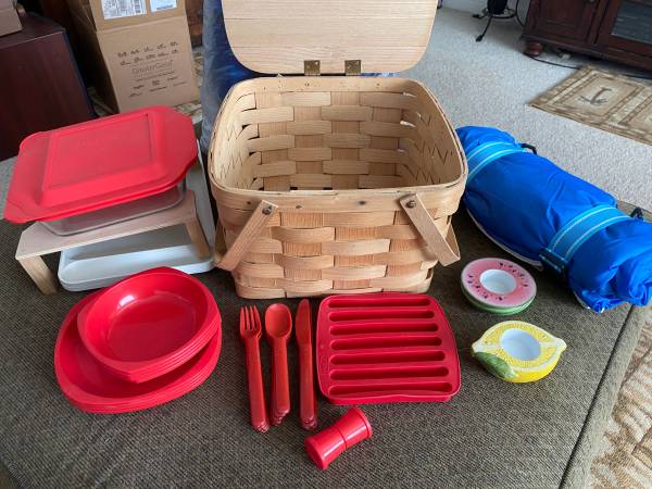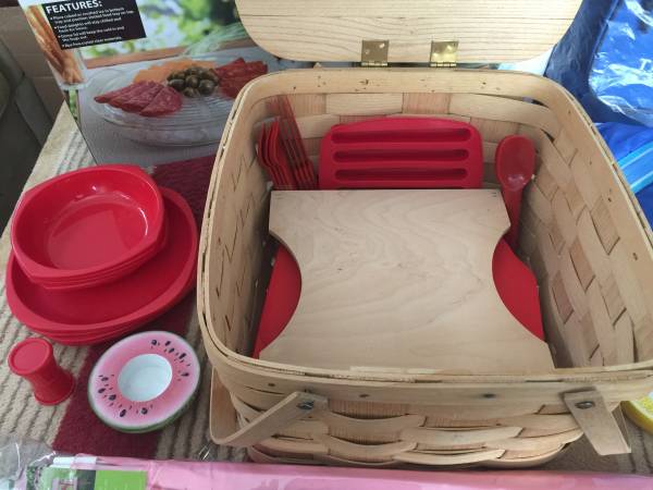SELLING THIS REALLY REALLY NICE WOVEN WOOD PICNIC BASKET W/ ALL THE FIXINS ( ACCESSORIES ) THIS IS A REALLY GREAT SET ...