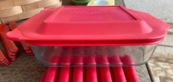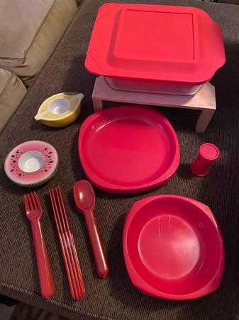 RED PLASTIC DISHES , W/ FORKS, KNIFES & SPOONS , SALT & PPPER SHAKER
