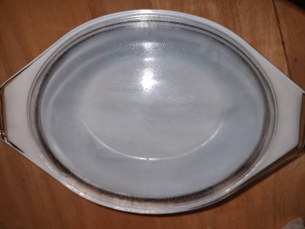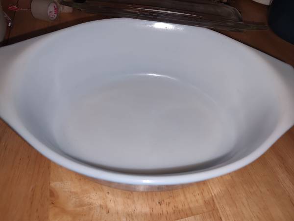 This pretty Pyrex Blue Tulip vintage 1.5 quart oval milk glass casserole has a clear dome lid and is from the 1960s. 7" wide and 10 1/4" long. Inside is 6 1/2" x 8" x 3". Pyrex 043 sky blue color with a line of white tulips on each side. No chips or cracks.