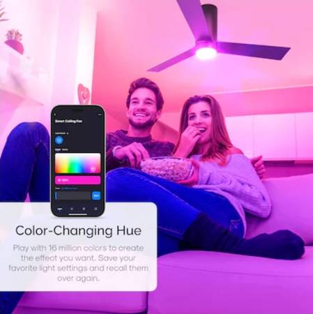 16 MILLION LIGHTING COLORS TO SET JUST THE RIGHT MOOD. MEMORY RESTART SETTINGS SO YOU TURN THE FAN ON TO YOUR LAST USED SETTING.