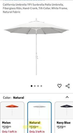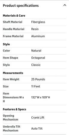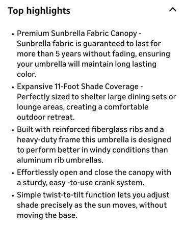 THIS MADE-TO-LAST 11FT. NATURAL SUNBRELLA SUNBRELLA BEAUTY IS A PERFECT EXAMPLE. THE BREATHABLE FABRIC STRETCHED OVER PROPRIETARY C.U. WIND-FLEX FIBERGLASS RIBBED FRAME HAS A 5YR. GUARANTEE. THE MODEL FEATURES TWIST-TILT TECHNOLOGY MAKING FOLLOWING THE SUN A BREEZE.