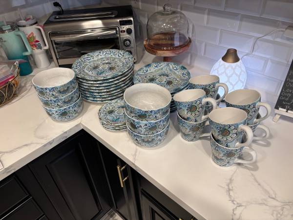 Includes: - 9 (11”) full size plates (meal) - 9 (9”) mid size plates (salad) - 4 (6.5”) small plates (saucer) - 7 (6”) bowls (2 bowls have small chip in them) - 9 coffee cups Items range from $12 to...