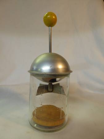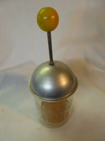 This is a vintage 1 cup glass food chopper with yellow wooden knob. Made by Dispensers Inc. Los Angeles New York. The lid is aluminum. Original wood disk is inside the 1 cup measure. 8 1/2" tall, 3" in diameter. Great condition. $15. It is in Penryn. Call show contact info