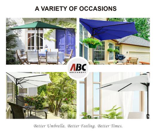NEW Half Umbrella Outdoor Patio Shade - 9 ft Patio Umbrella with Easy Crank in Turquoise Blue. The brand is ABCCANOPY. It's brand new in box. No stand included. From a smoke-free & pet-free home.