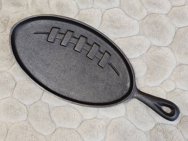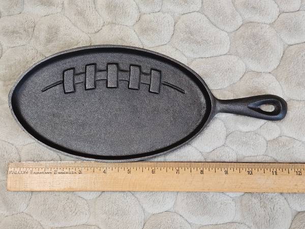 This cast iron skillet/griddle is perfect for making cookies or pancakes in the shape of a football. It is compatible with both electric and gas stoves. The pan is made of durable cast iron material and comes in a sleek black color. The skillet/griddle is the perfect addition to any collection and is sure to impress your football friends.