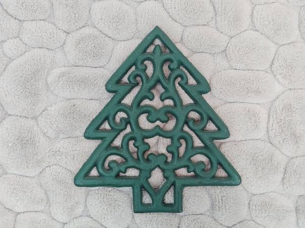 Add some vintage charm to your kitchen with this green Christmas Tree Cast Iron Trivet. This 6 7/8" tall by 6" wide tree shaped footed hot plate is perfect for protecting your kitchen counters or dining table from hot pots and dishes. Made from durable cast iron, this trivet features a charming green evergreen tree design that is sure to impress your guests.