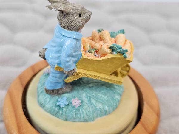 Cute Easter music box. Appears to have once been a snow globe, but the globe has been removed. A handsome bunny in a blue suit is pushing a wheelbarrow filled with carrots on a pastel green grass with flowers stand. It sits on a wooden round base. The music box is working and plays Easter Parade. Would make a cute Easter or nursery decoration.