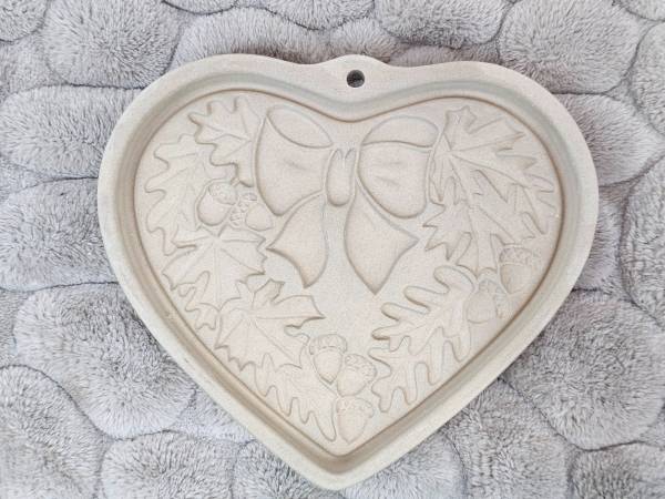 This limited edition Pampered Chef cookie mold, #2927, from the First in Seasons of the Heart Series features a beautiful autumn wreath design and is made of durable stoneware material. The mold is designed for creating unique and delicious cookies, candies, and even paper ornaments in the shape of a heart. The beige color adds a touch of warmth to your kitchen as you create your favorite treats. The mold is perfect for those who love to bake and decorate their own cookies. The brand Pampered Chef is known for its high-quality kitchen products and this mold is no exception. Get creative this season and impress your family and friends with your unique and delicious autumn wreath cookies using this Pampered Chef cookie mold.