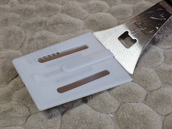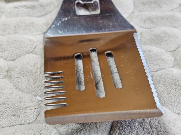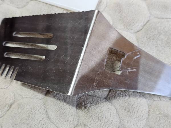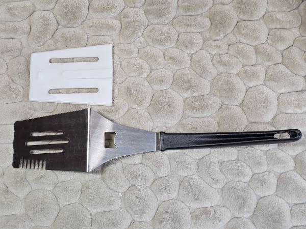 The Pampered Chef Bar-B-Boss grilling multi-tool will make your backyard barbeques epic! This very high quality spatula can flip, pierce, cut...even open bottles! Comes with protective plastic sheath for safe storage. Handle has hanging hole built right in! Easy clean up as it's dishwasher safe! Excellent used condition