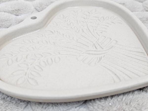 Create beautiful and delicious heart-shaped cookies, candies, even paper ornaments with this brand new Pampered Chef Stoneware Bountiful Cookie Mold. The mold is made of high-quality stone material and is designed with intricate wheat pattern details depicting a bountiful harvest. The beige neutral color of the mold gives it a modern and sleek look that will complement any kitchen décor. This cookie mold is 5.25 inches in height and is perfect for baking homemade cookies for any occasion. Whether you are a professional baker or a beginner, this mold will help you create beautiful and unique cookies every time. It's a great addition to your kitchen collection and a thoughtful gift for someone special.