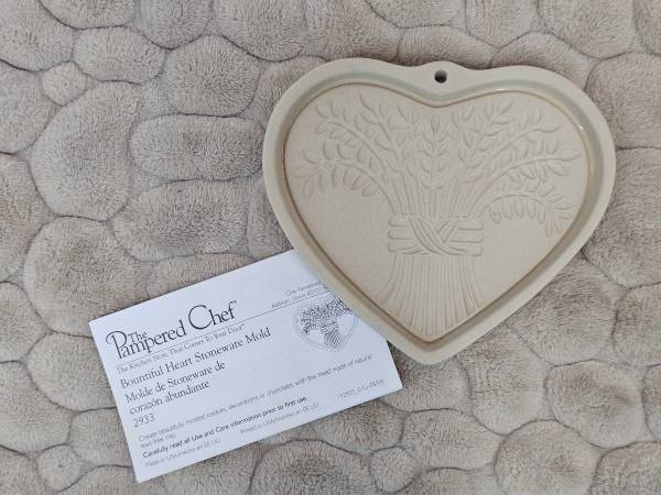 Pampered Chef Stoneware Bountiful Heart Cookie Stone Mold #2933 In original box and includes Use and Care/Recipe Cards. Appears to be unused.