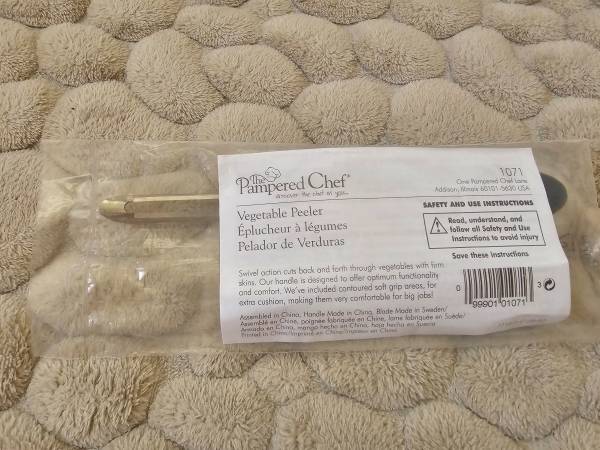 The Pampered Chef Vegetable Peeler is your all-purpose tool for potatoes, apples, carrots and other firm-skinned veggies. The swivel-action blade saves you time—it’s sharp on both sides, allowing you to peel back and forth, instead of in just one direction. NEW IN ORIGINAL PACKAGING!