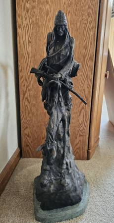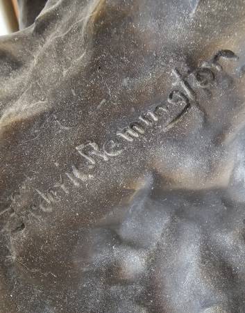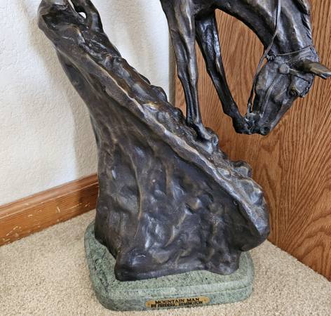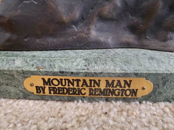 Mountain Man was Remington’s 9th bronze and was completed in 1903. It’s subject is of an old Iroquois trapper and horse descending a steep hill and their motion is suspended in mid-stride. This statue is reproduced in the purest American bronze, cast by the superior lost wax process, finished in a bronze patina like the original and then hand-rubbed to bring out detail and highlights. The statue is then mounted on a fine marble base with an etched brass name plate. Remington's signature is on the bronze. The incredible detail of this sculpture is a Remington master works.