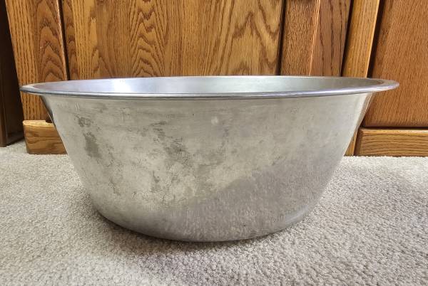 This large vintage wash basin is a durable and practical addition to any camping or outdoor trip. Made of aluminum, it is lightweight and easy to transport, as well as being easy to clean. The round shape and silver color add a touch of retro charm to any setting, while its durable features ensure long-lasting use. Perfect for use as a washing basin, vegetable/fruit bowl, or for camping, this wash basin is suitable for a variety of needs. Whether you're a frequent camper, have a farmhouse décor, or just looking for a durable and practical large pan, this wash basin is an excellent choice. Hanging hole in rim. Nice vintage condition with normal signs of use - and a good polish could restore some of the luster (or leave it as is - with character)!