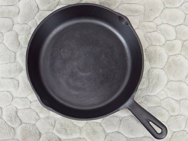 Better than new cuz you don't have to worry about factory seasoning failure - this skillet has been stripped down to bare iron and had 4 layers of seasoning baked on. It's ready and waiting to impress even the most discriminating palate. NO CRACKS, WARPS, OR WOBBLES
