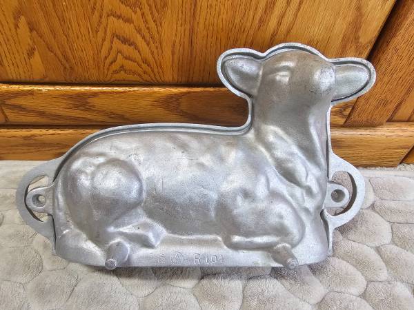 Discover the vintage charm while crafting delightful treats with this vintage heavy cast aluminum baking mold, showcasing a charming lamb design that's perfect for any occasion. The mold had identifying markings "R104" & "L104" for the right and left side, AACC for quality mark (American Association of Aluminum Casting), and 12, for the length of the mold. It is a collectible item from the kitchen and home category, specifically within bakeware and is ideal for creating intricate lamb-shaped confections or chocolate figures, adding a touch of whimsy to your bakery creations. Fashioned from durable cast aluminum and finished in an elegant silver hue, this mold promises a lasting addition to your baking toolkit. Whether you're an experienced baker or a home enthusiast, this mold is sure to impress with its unique animal shape and versatility. Excellent vintage condition - just waiting for it's new home!