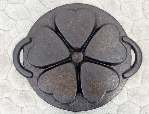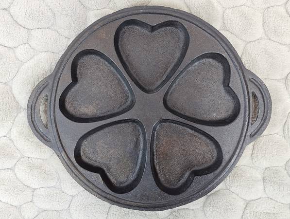 This vintage cast iron gem pan with the shape of hearts is a heavy-duty piece that can create unique treats for your loved ones. Perfect for cookies, cornbread, or candy - the possibilities are only bound by your own imagination. The pan is compatible with induction, electric, and gas stoves, making it versatile for any kitchen. Crafted in a round shape with handles, the five heart-shaped sections make this mold pan perfect for creating sweets with a touch of love. Each heart is 3 1/4" x 3 1/4". The black color adds a vintage touch to your kitchen, and the opening on either end in the handles makes it a great piece for wall décor. With flat-bottomed and oven-safe features, this cast iron mold is perfect for baking. Unbranded with no maker marks. Perfect for the cast iron collector or any baking enthusiast! Completely restored - like new condition! Add this to your collection of collectible cookware and impress your guests with unique treats
