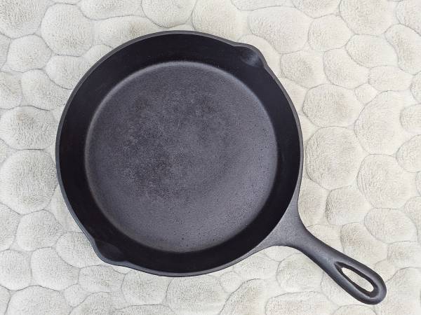Better than new cuz you don't have to worry about factory seasoning failure - this skillet has been stripped down to bare iron and had 4 layers of seasoning baked on. It's ready and waiting to impress even the most discriminating palate. NO CRACKS, WARPS, OR WOBBLES