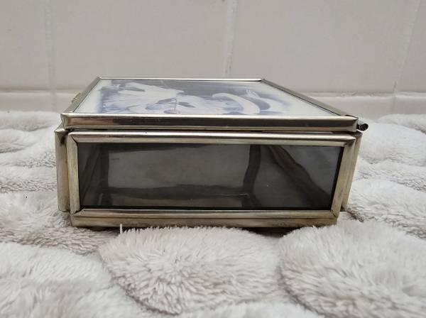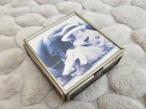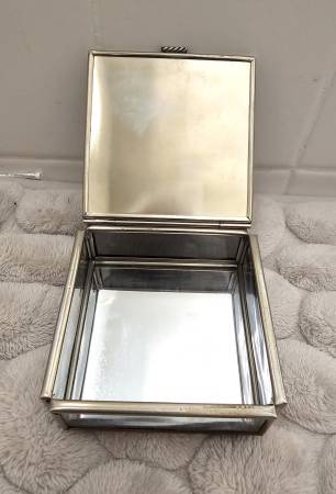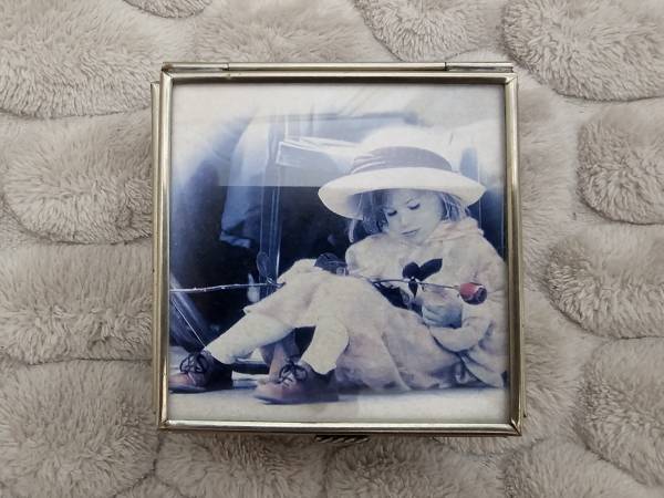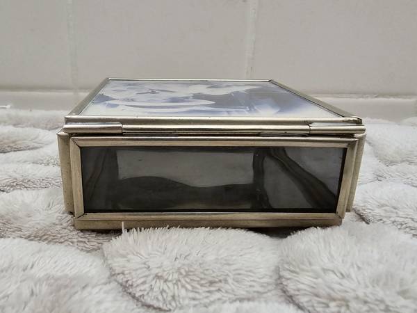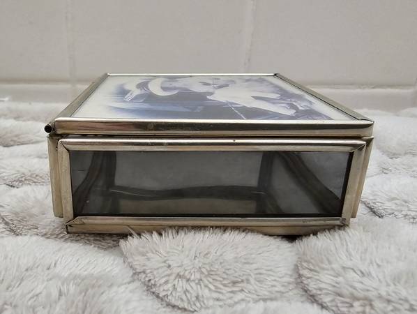 Vintage Enesco Trinket Box Glass & Brass Mirrored Footed Hinged Lid Girl & Rose measures 3" x 3" x 1.5". I didn't shine it up, but could easily be done - I prefer the vintage patina that adds character to the piece!