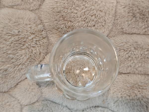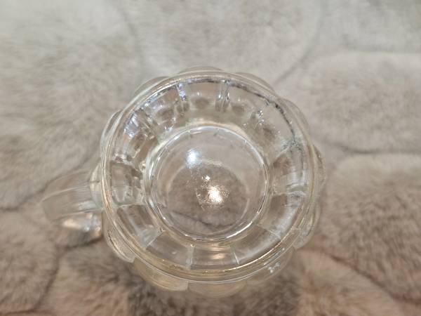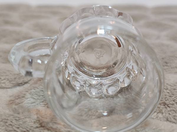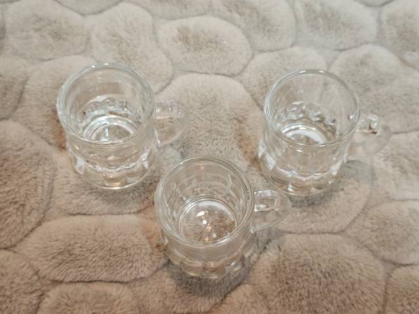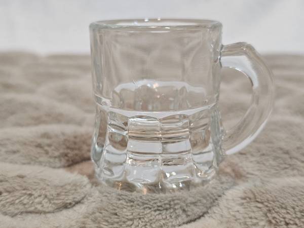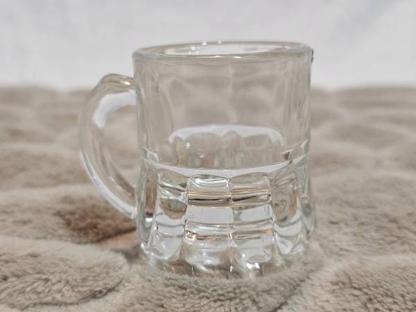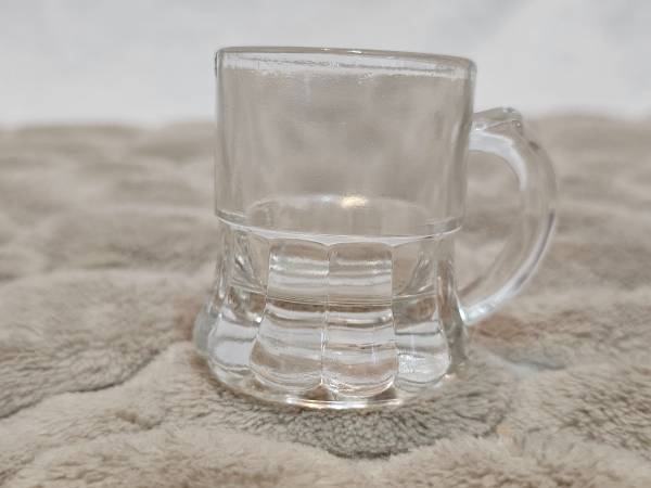 Vintage Federal Glass 1940's Clear Miniature Mug. Typically used as barware - 1 oz. shot glass, but due to their durability and size, also works well as a toothpick holder. Measures 2 inches tall. Ribbed bottom. Two of the three have the federal shield on the bottom, which, you can view through the top, and are in excellent used vintage condition. One is unmarked and has a manufacturing flaw/chip along the seam on the upper outside rim and has a few scratches to be expected with use and age - good used vintage condition.