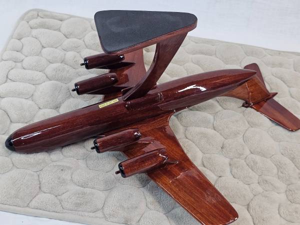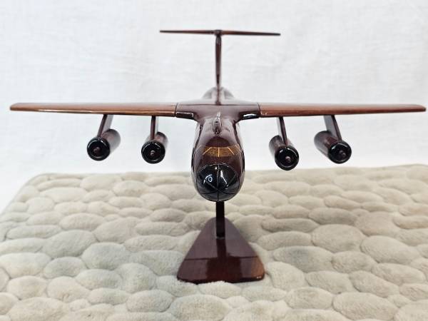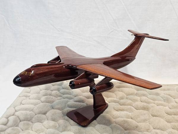 Beautiful handcrafted wooden model of the Lockheed C-141 Starlifter, a strategic airlift aircraft that served the United State Air Force for over four decades. It was primarily used for strategic airlift, capable of transporting combat forces, equipment, and supplies over long distances, including air, land, and airdrop deliveries. It also performed humanitarian relief flights and aeromedical evacuations.