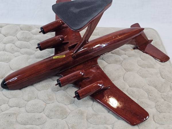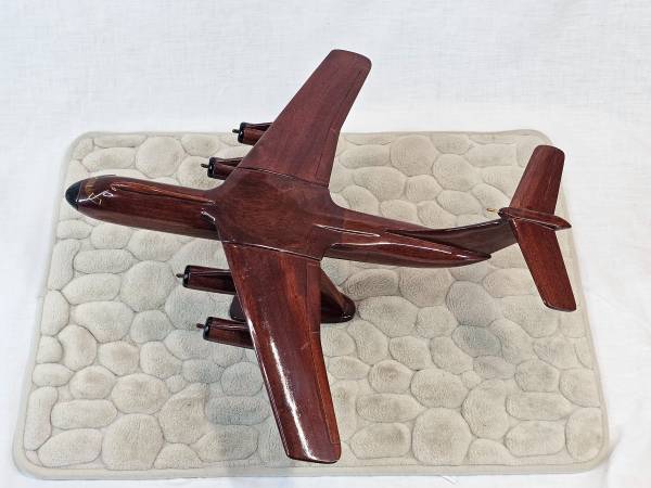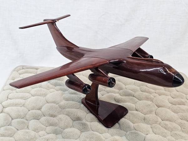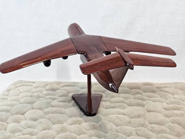 The model has been carefully hand crafted in great detail from solid mahogany and polished to a high gloss finish. The C-5 Galaxy is a large military transport aircraft designed by Lockheed, known for its ability to carry outsized and oversized loads. Great gift for any aviation enthusiast, veteran, or collector. Excellent vintage condition. Stands about 8" tall.
