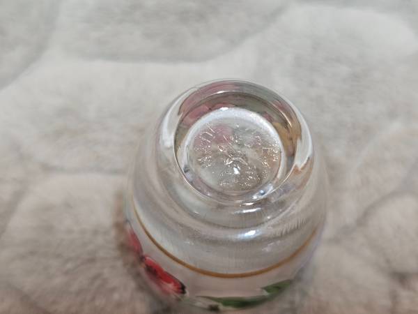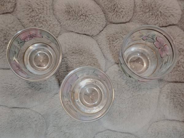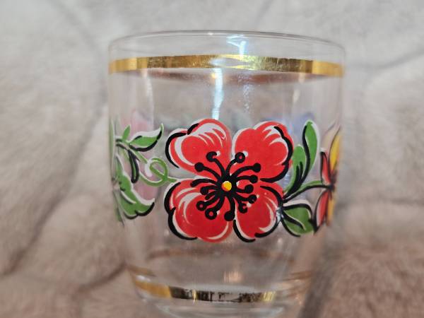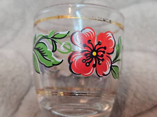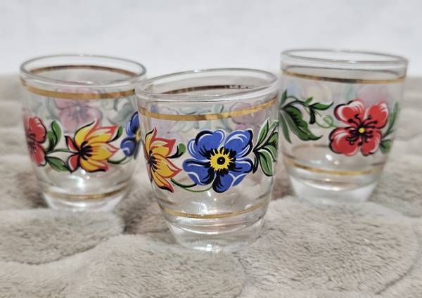 Beautiful vintage handpainted shot glasses. Thin gilded band on top and bottom of floral design/motif consisting of red poppies, indigo violets, gold and yellow marigold flowers with green leaf detail between the flowers. Made in Italy. No chips or cracks. Some wear to the gold, particularly with one more than the other two. Each glass is approximately 2 inches tall with the upper diameter at 1 1/2 inches. Great gift for the collector of barware or MCM glassware. Really nice vintage used condition.