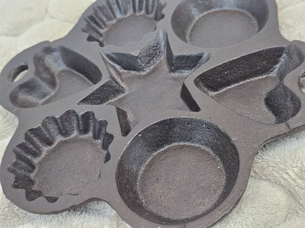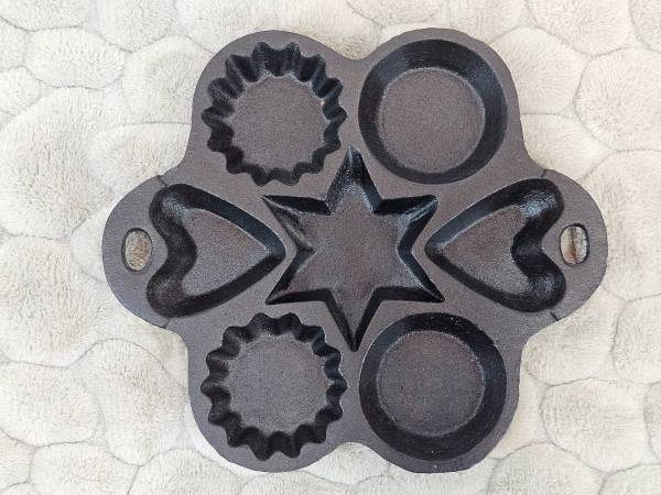 This vintage cast iron gem pan features seven cups in total, with two heart, two fluted, two round, and one star in the middle. It is a heavy-duty piece that can create unique treats for your loved ones. Perfect for cookies, cornbread, or candy - the possibilities are only bound by your own imagination. The pan is compatible with induction, electric, and gas stoves, making it versatile for any kitchen. Crafted with seven sections that create four different shapes, this mold pan is perfect for creating sweets with a touch of love. The black color adds a vintage touch to your kitchen, and the opening for hanging makes it a great piece for wall décor. With flat-bottomed and oven-safe features and handles on both sides, this cast iron mold is perfect for baking. Unbranded with no maker mark - possibly older John Wright or similar. Perfect for the cast iron collector or any baking enthusiast! Completely restored - like new condition! Add this to your collection of collectible cookware and impress your guests with unique treats