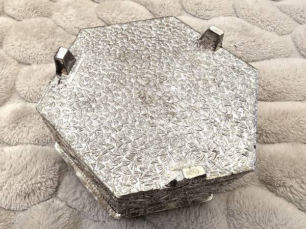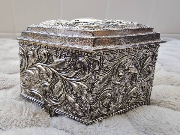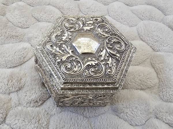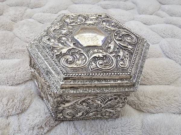 Hexagon shaped silver tone footed trinket/jewelry box adorned with an intricate leaf pattern. Inside is lined with a deep red (almost maroon) velvet cloth. Slight wear/tarnishing, but that adds to the patina and character of the piece! Slight damage to the right hinge, but pin still holds the lid on fine. Really nice vintage piece!