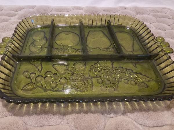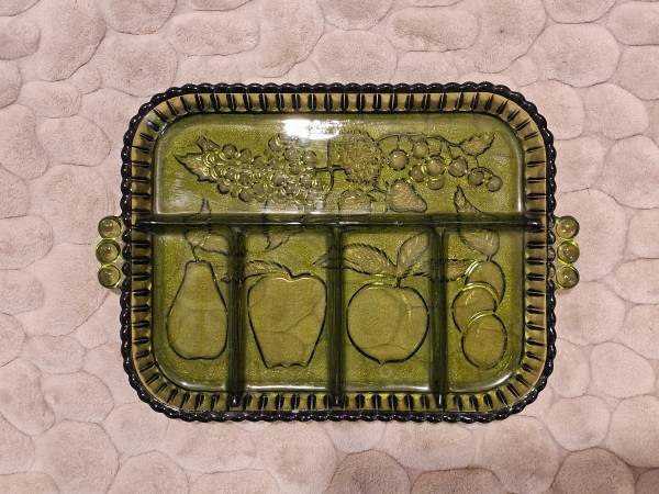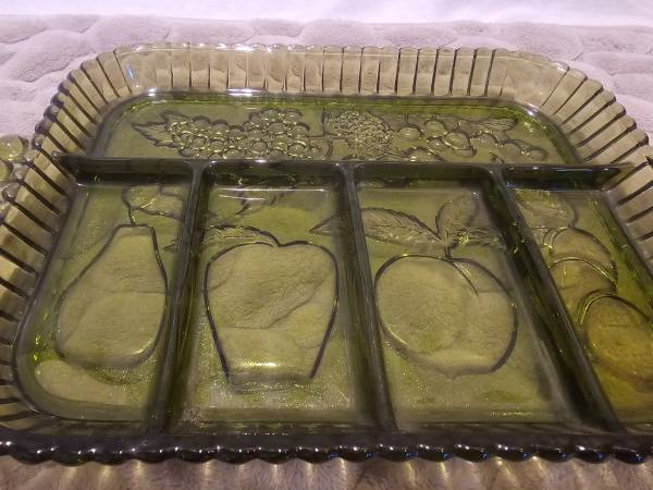 Vintage Indiana Glass divided relish tray with five compartments. Bring vintage charm and functionality to your table with this authentic Indiana Glass avocado green divided relish tray, crafted in the classic mid-century modern style. Adorned with beautifully embossed fruits—grapes, pears, apples, peaches, cherries, strawberries, and plums—this vibrant avocado green serving dish is perfect for snacks, appetizers, relishes, and condiments. Typical of the 1960-70s MCM designs, this pressed glass tray is made in the US with an embossed fruit or harvest pattern. Another common detail of the 60-70s is the avocado green color of this tray. Vintage original, this tray is the perfect addition to any retro lover's collection and a functional item useable everyday or while hosting a party.