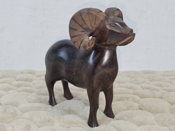 The Big Horn Mountain Ram Sheep sculpture is a large, hand-carved art piece made of ironwood. The sculpture features intricate carving details that depict a Big Horn Ram Sheep, showcasing the craftsmanship of the artist. This vintage piece is an original work of art, highlighting the theme of nature and wildlife through the use of wood as the primary material for the sculpture. It is a unique and visually striking addition to any art collection or home décor. Excellent vintage condition.