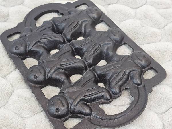 The brand John Wright is known for producing high-quality cast iron cookware, and these molds are no exception. The cast iron material of the molds is durable and long-lasting, making them a great addition to any kitchen collection. The "All American Gingerbread Man" design makes this perfect for the both the Christmas holiday and 4th of July seasons, adding a festive touch to any baking or cooking routine. The mold measures 8.75 inches in length and 6 inches in width, and has six cavities. Cast iron is compatible with gas or electric stoves and is great for baking and other cooking needs. You are only bound by the limits of your imagination!